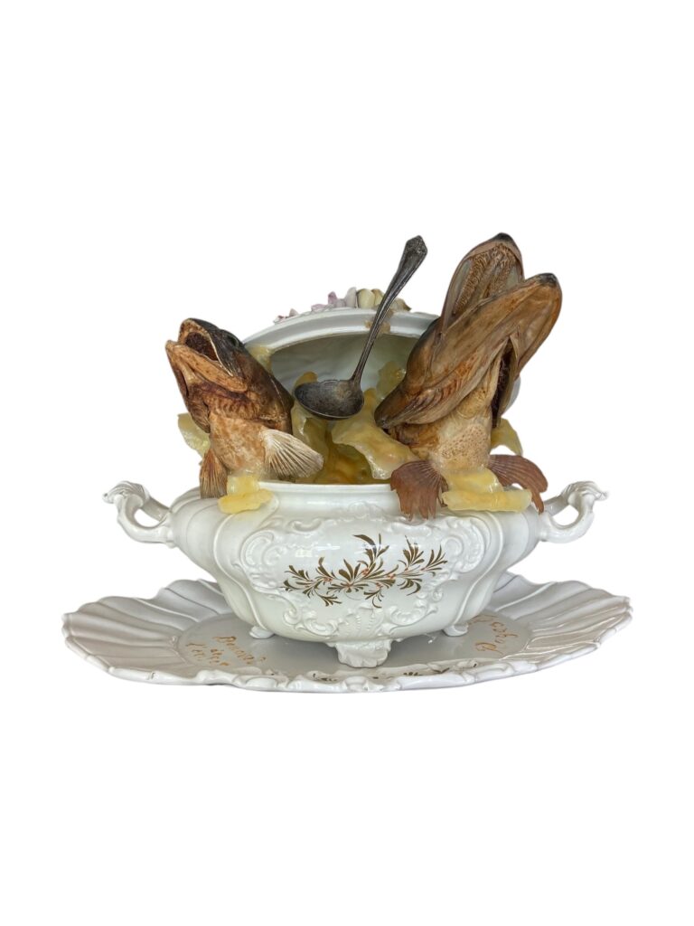 Ceramic terrine, wax, resin, taxidermy, spoon