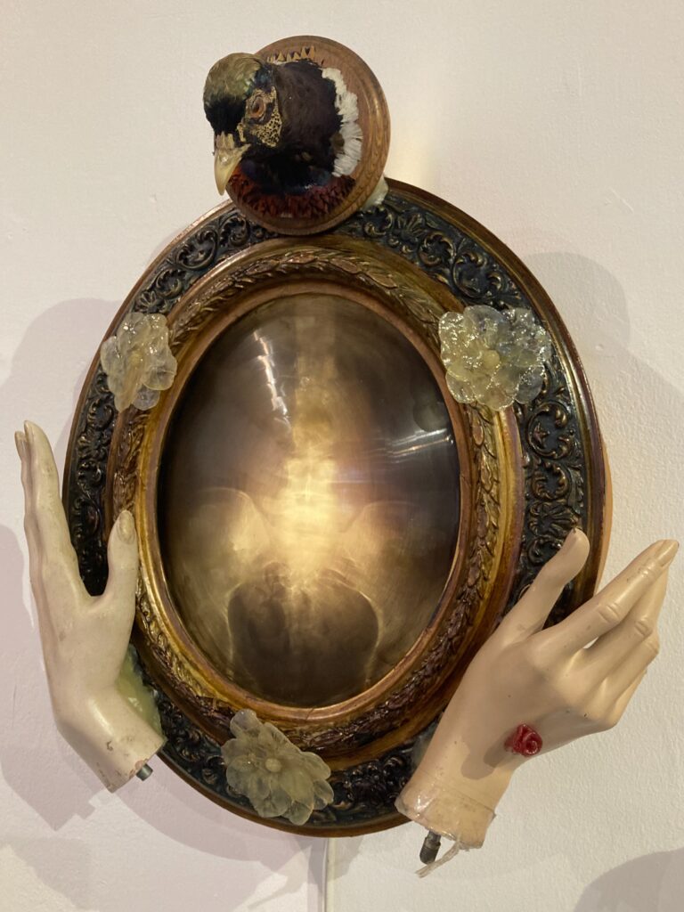 Light object with dried flowers, water transferred etchings, wax, radiograph, taxidermy, mannequin hands, in antique frame with convex glass