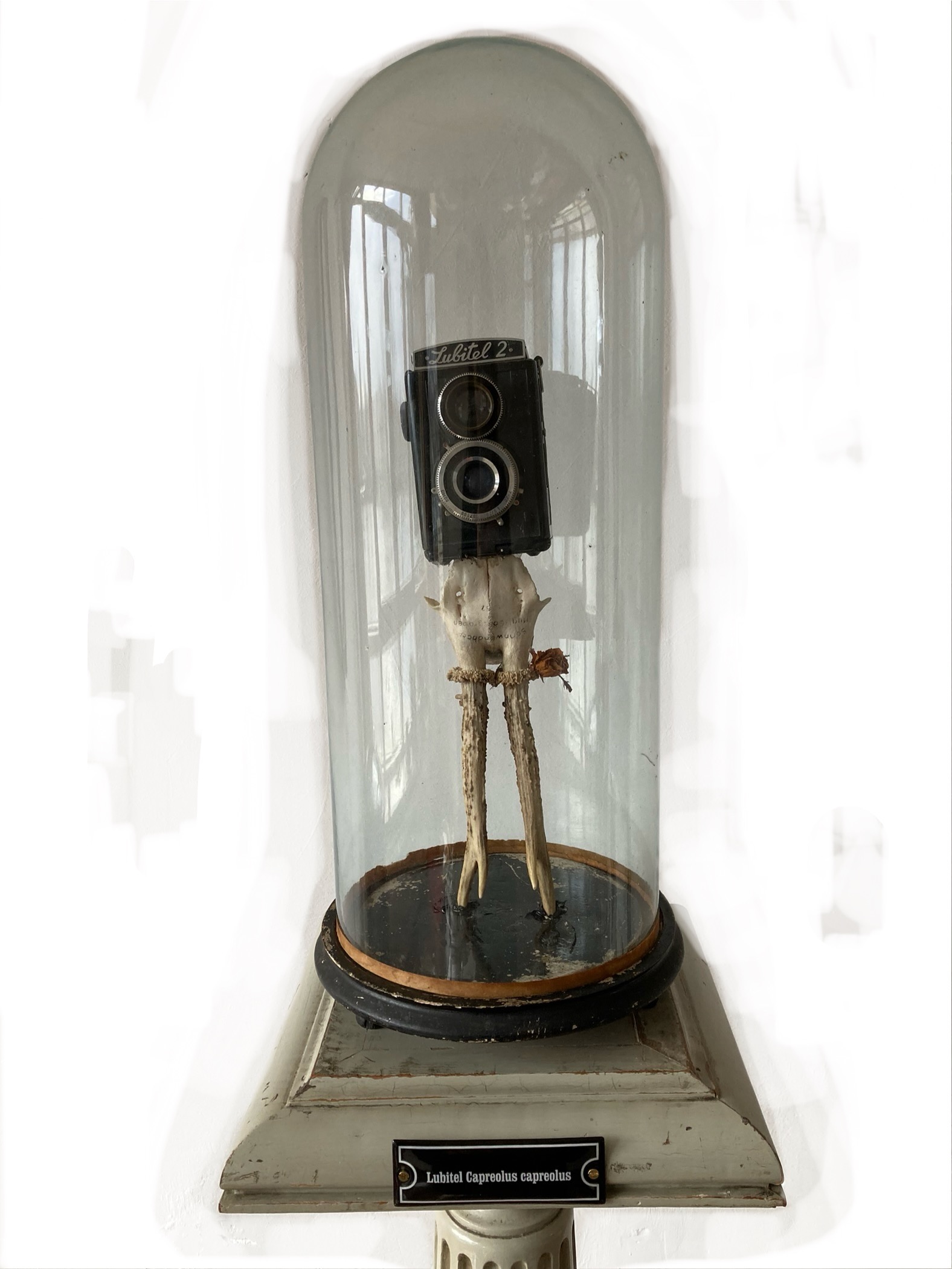 LUBITEL CAPREOLUS CAPREOLUS LUBITEL CAPREOLUS CAPREOLUSRayastre2024Sovjet photo camera, deer skull, dried rose, bell jar170 – 40 – 40 cm67 – 15,7 – 15,7 inches2,200 euro Made possible by